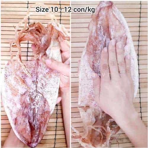Khô mực size 10 – 12 con/kg dai cỡ 1 gang ruõi tay và bề ngang to hơn mực 14- 16 con.