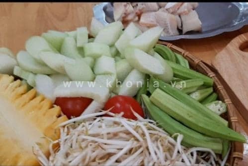 - Để nồi nước sôi thêm độ 5-7 phút, anh chị hãy tiếp tục “phù phép” nồi canh chua của mình bằng cách cho thêm giá, bạc hà, đậu bắp và ớt vào cùng.