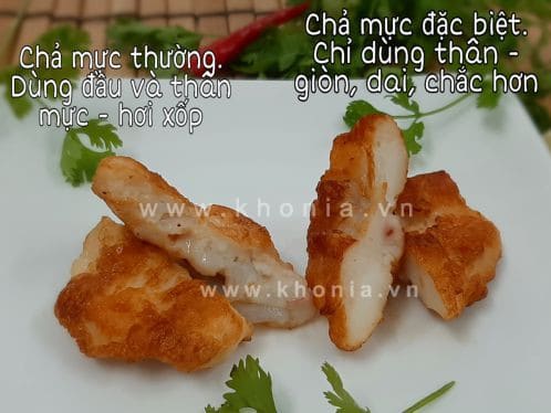 Mình có chụp hình hai miếng chả mực cắt dọc để anh chị dễ hiểu. Bên trái là loại chả mực thường, anh chị thấy chả hơi xốp phải không? Còn bên phải là loại chả mực đặc biệt, miếng chả săn chắc ăn sẽ dai ngọt, giòn hơn.