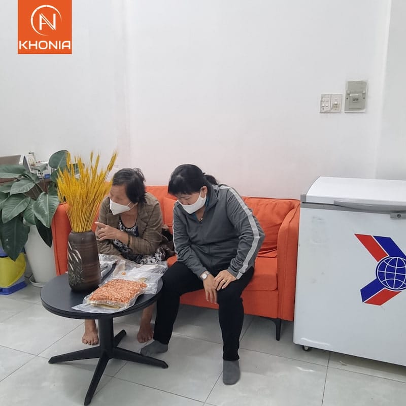 Lần này chị Lan dẫn theo mẹ đến trực tiếp lựa khô cá để gửi hàng qua Mỹ cho cháu trai. Chị bảo Út Loan chia làm 2 đơn. 1 đơn hàng là KHONIA đóng gói gửi đi qua trước. Còn 1 đơn hàng sẽ xách tay đi sau.
