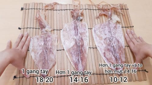 Khô mực size 14 – 16 con dài 1 gang rưỡi tay và to hơn size 18 – 20.